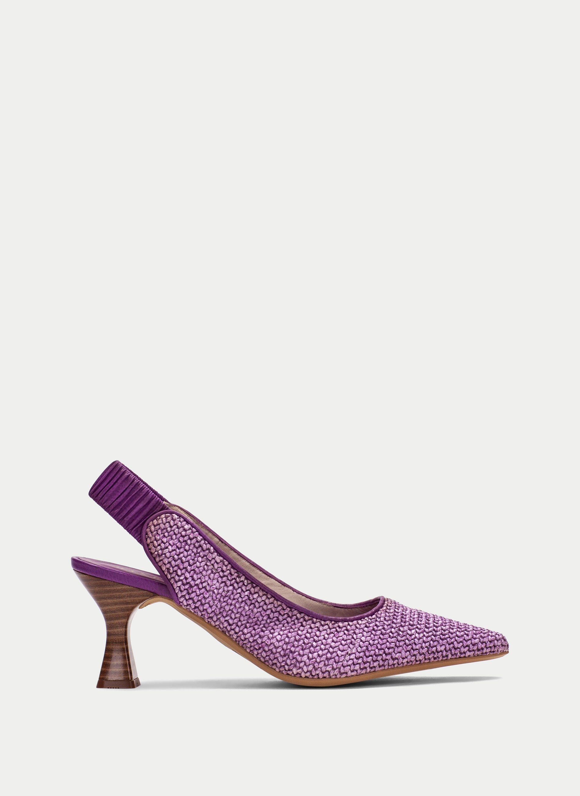 Pointed-toe sling back pump. This shoe features TRIFLOW technology, which cushions each step, providing flexibility and comfort with its triple cushioning. Leather trim, stacked heel, and beautiful woven texture.